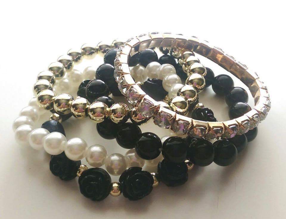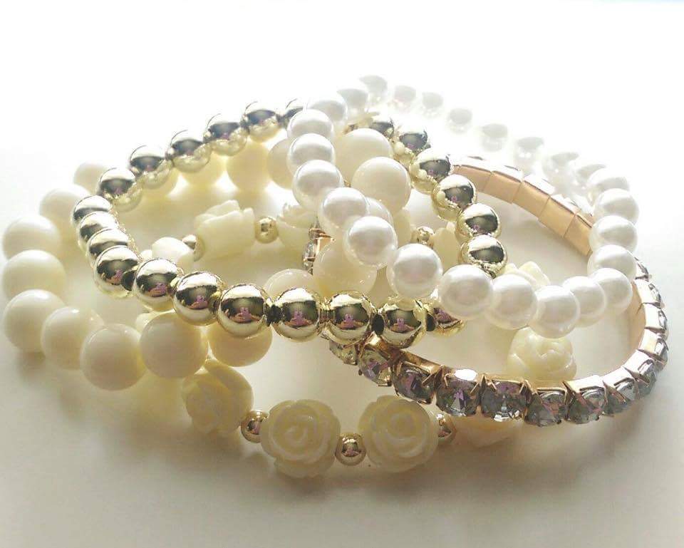 5 bracelets in each set... 1 roses, 1 solid color beads, 1 pearl beads, 1 gold beads and 1 fashion diamond beads.