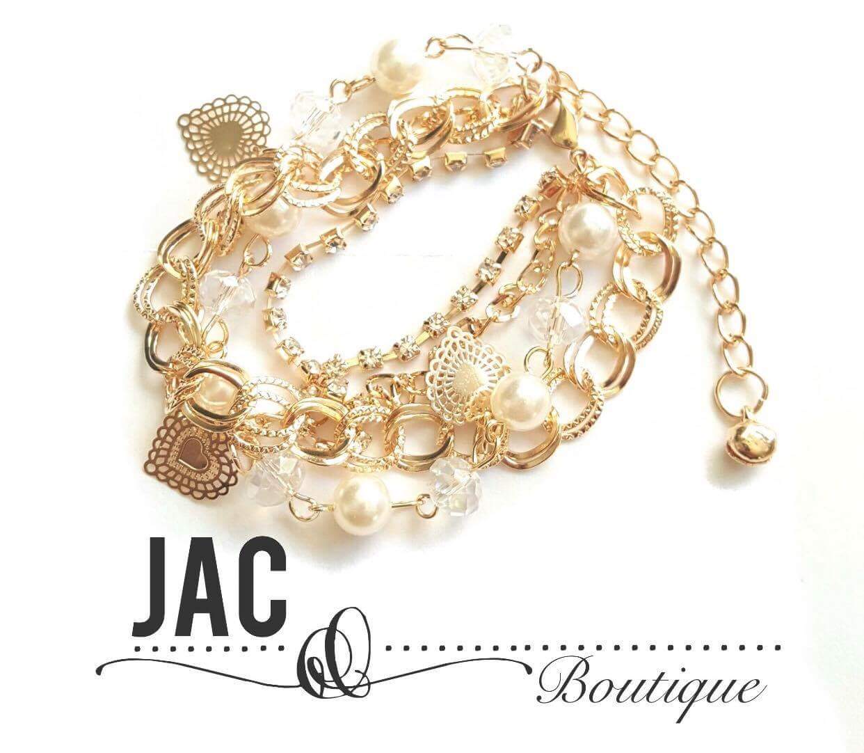 Beautiful, decorative, 4-piece multi-layer, gold plated bangle with heart charms. Just gorgeous.