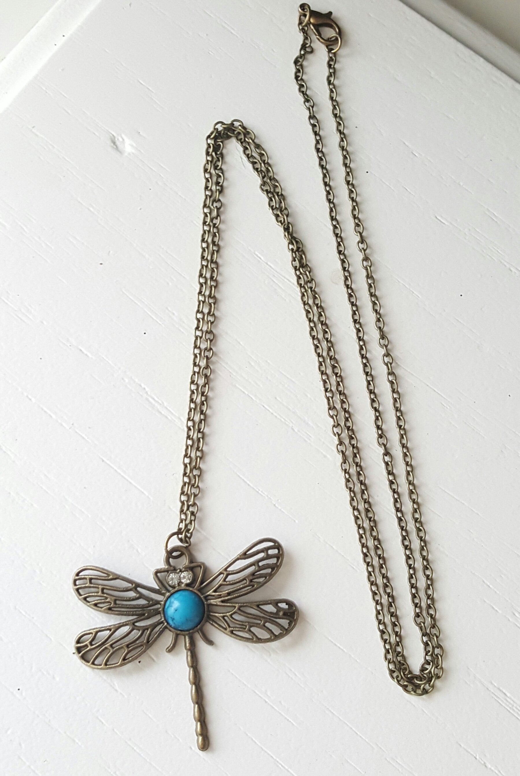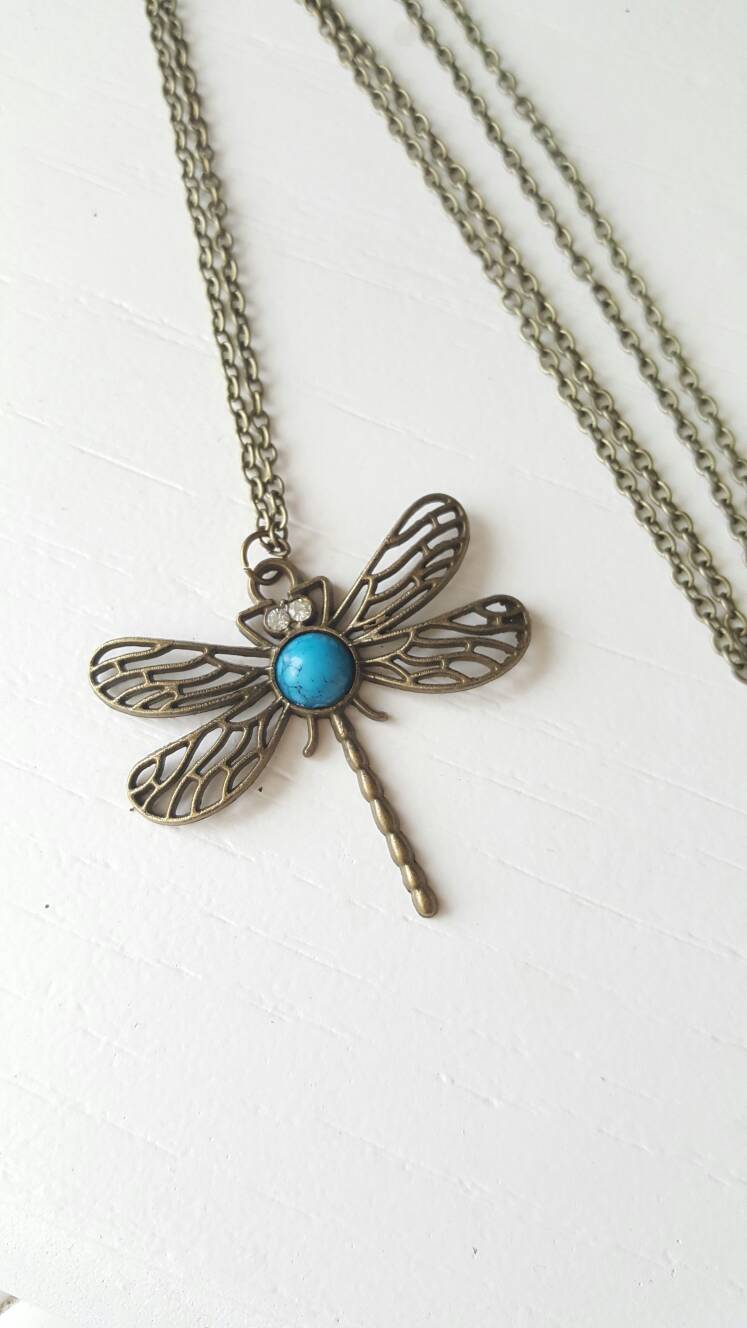 Dragonfly Long Necklace - 31" long necklace- 2" pendant with Turquoise Stone