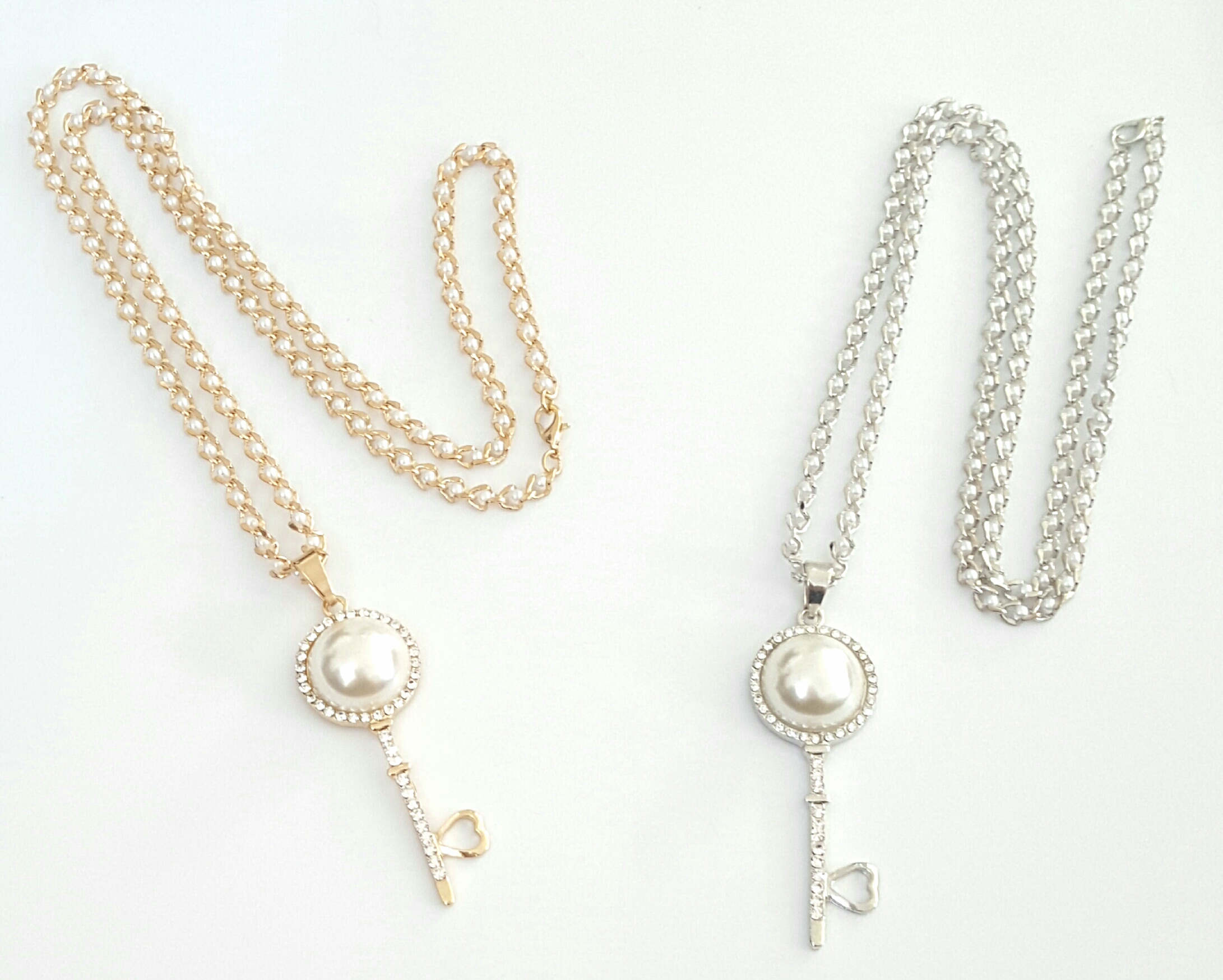 Key to My Heart Necklace, Pearl Key with detailed rhinestones, Long Necklace