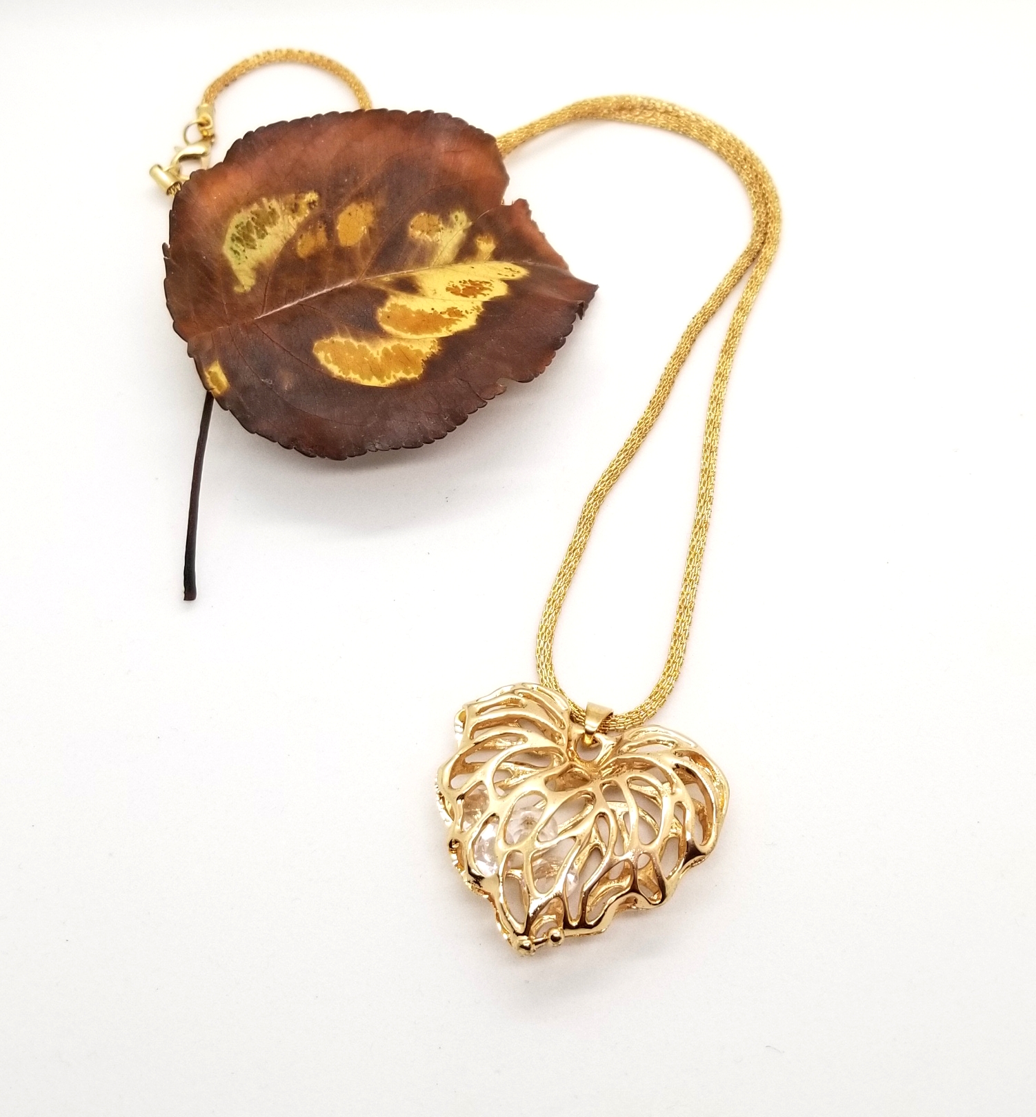 Beautiful 26" long necklace with rhinestones in a heart - rosegold and silver - heart charms, mesh necklace. 1.5" charm.