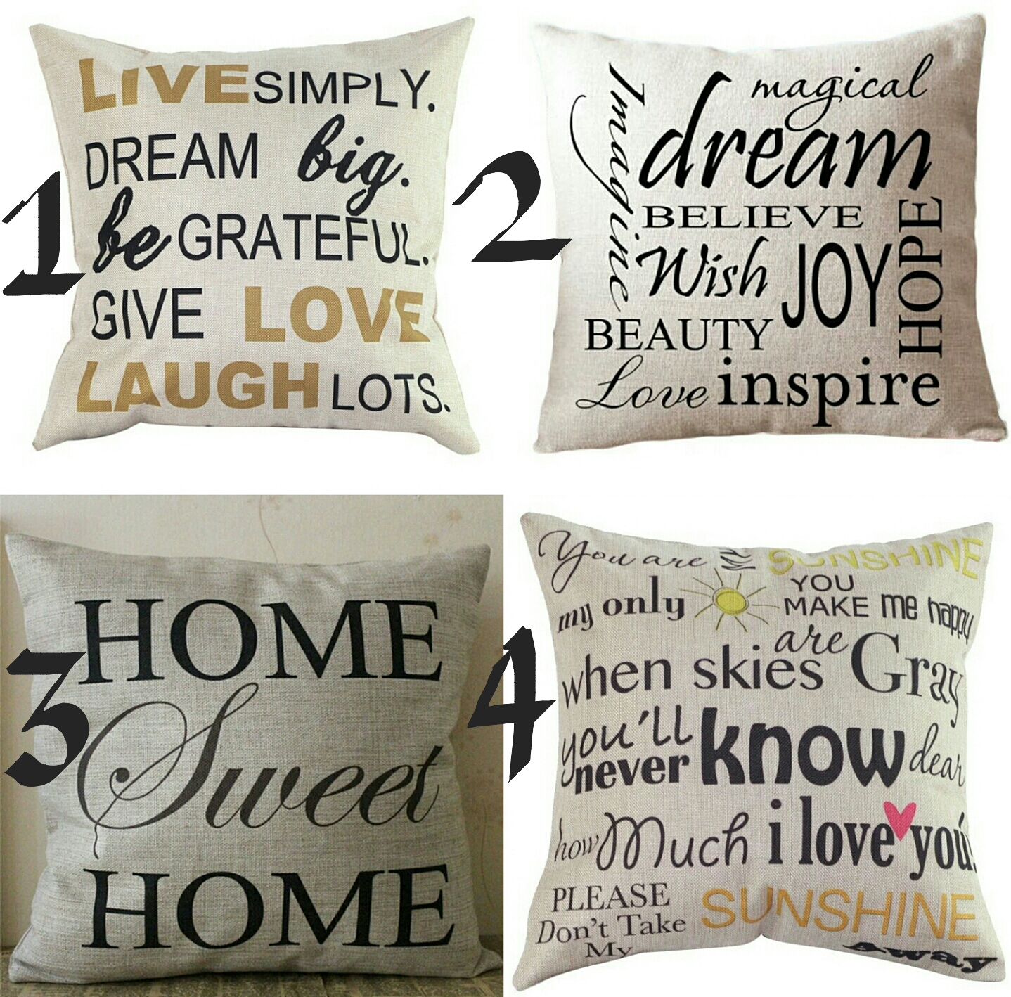 Decorative Pillow Covers - Inspirational Pillow Cases - Home Sweet Home - You Are My Sunshine - Live Love Laugh - Dream Believe Wish - 18x18